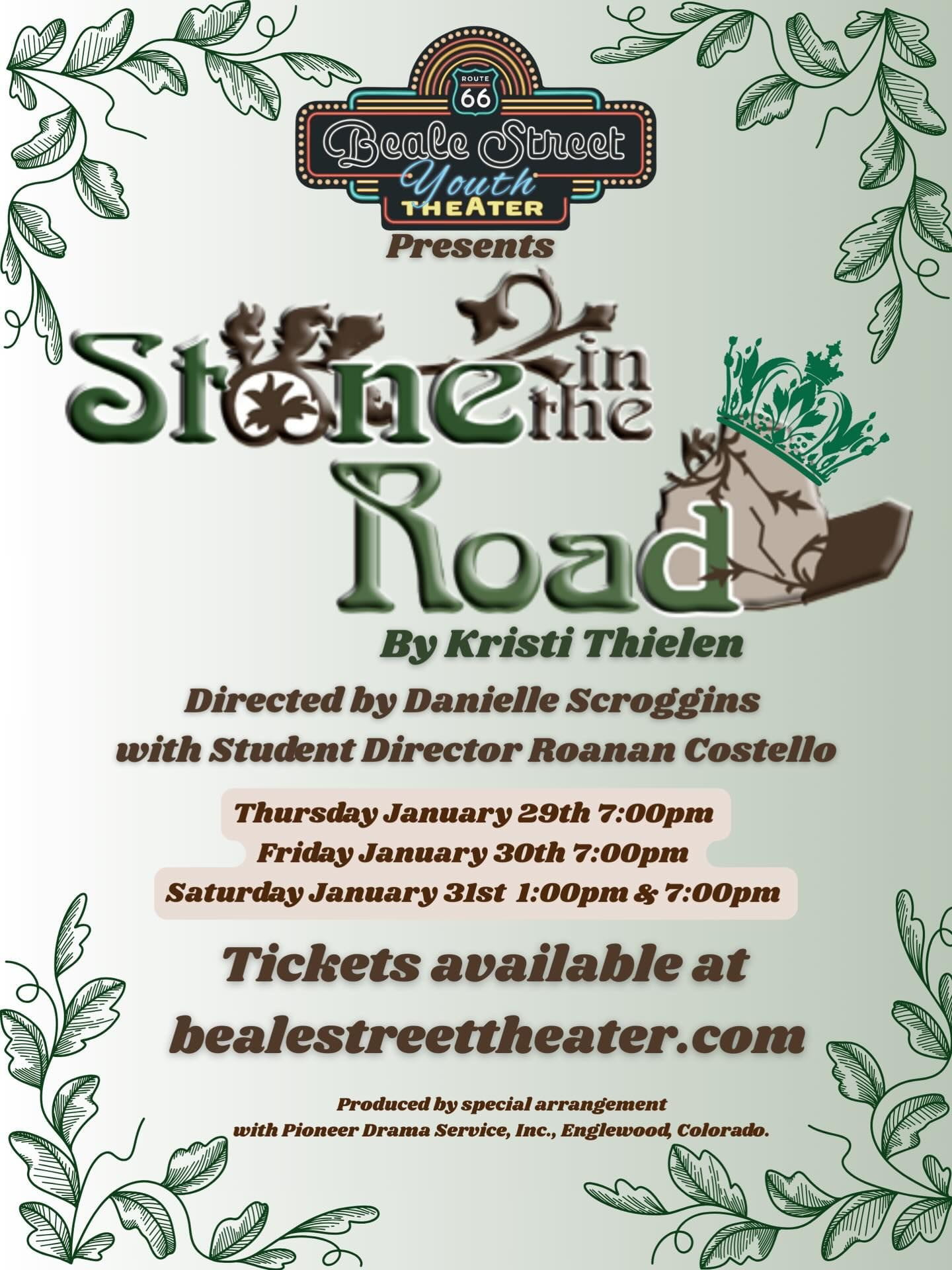 Join us for our Beale Street Youth Theater production of Stone in the Road. Families will enjoy watching this classic tale in which a queen puts her subjects to the test: who will move the large boulder from the road? Anyone kind enough to move the stone will be handsomely rewarded with a job as royal counselor to the queen! A host of wacky characters pass through the scene as the queen and her faithful servant, Barcarole, watch from a hiding place to see who will be unselfish. Certainly not Rigoletto, the pompous barber, who refuses to risk bruising his precious hands. Will the burglars do the job? Ha! More passers-by include the snobby Mrs. Brenzinski and her bratty children, a disgruntled milkman, a runaway school principal and a retired gypsy fortuneteller, not to mention Fenster Fibb, the tax collector, who scares off some of the travelers simply by showing up! At this rate, it seems that no one will pass the queen’s test! Join the queen and Barcarole as they come to see how actions, not complaints, often get a job done in this playful adaptation. This well-known fairytale entertains children of all ages while teaching the importance of helping others. Adult tickets are $15, $12, and $10, Teens (12-17) are $12, $10, and $8, Kids (4-11) are $10 and $5.