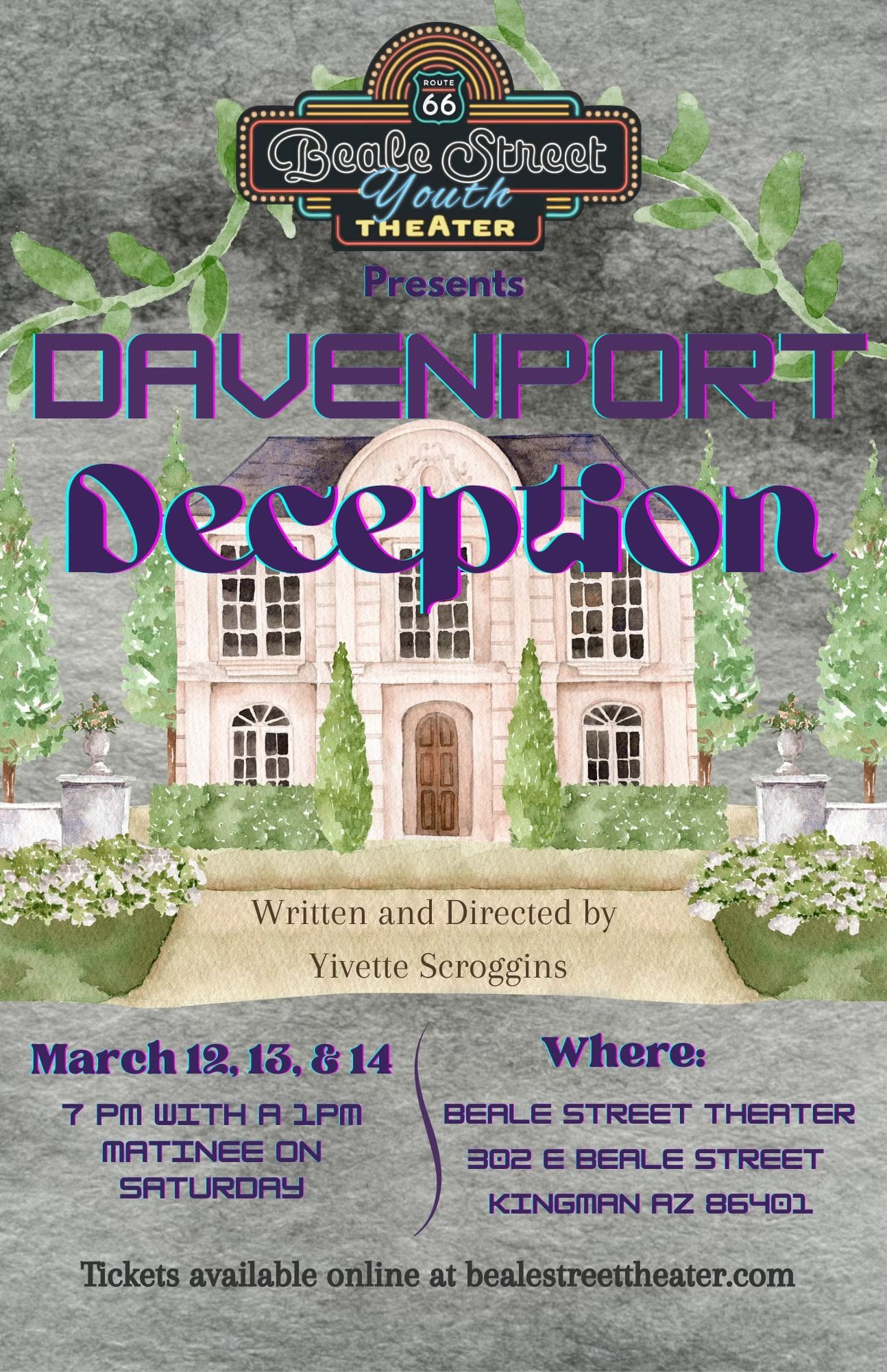 Join us for our Beale Street Youth Theater production of Davenport Deception. Wealthy hotel owner Max Davenport thinks he’s met the love of his life - on a blind dating website. Their train station meet up goes awry when Max picks up the wrong girl - a mysterious woman who is hiding a secret. Smith, Max’s best friend, and Jane, the hotel restaurant’s waitress, vow to uncover the mystery woman’s lies. We also meet guests and employees, many of whom aren’t exactly as they initially appear. Is Max being conned? Will Jane and Smith solve the mystery before it’s too late? Come discover the secrets of the Manor in Davenport Deception.
