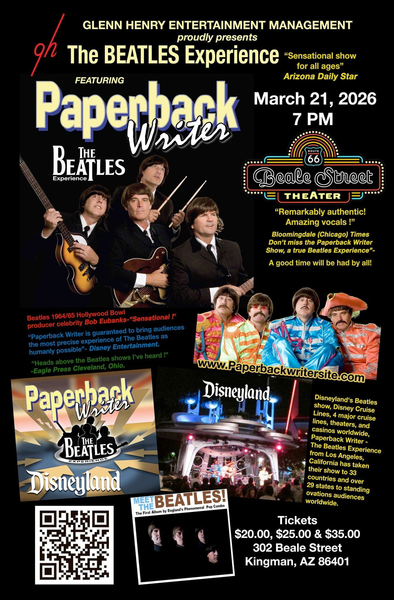 Featured at Disneyland, Disney Cruise Lines, 4 major cruise lines, theaters, and casinos worldwide, Paperback Writer -The Beatles Experience from Los Angeles, California has taken their show to 33 countries and over 29 states to standing ovations audiences worldwide. Hear the hits from the Ed Sullivan Show through the colorful Sgt. Pepper’s years and on to the roof tops of Let It Be performed with “spot on” vocal, look and sound alike ability. How about the national critics? “Paperback Writer is guaranteed to bring audiences the most precise experience of The Beatles as humanly possible”- Disney Entertainment. “Heads above the Beatles shows I’ve heard!” -Eagle Press Cleveland, Ohio. “Sensational show for all ages” Arizona Daily Star “Remarkably authentic! Amazing vocals!” – Bloomingdale (Chicago) Times Don’t miss the Paperback Writer Show, a true Beatles Experience”- A good time will be had by all!