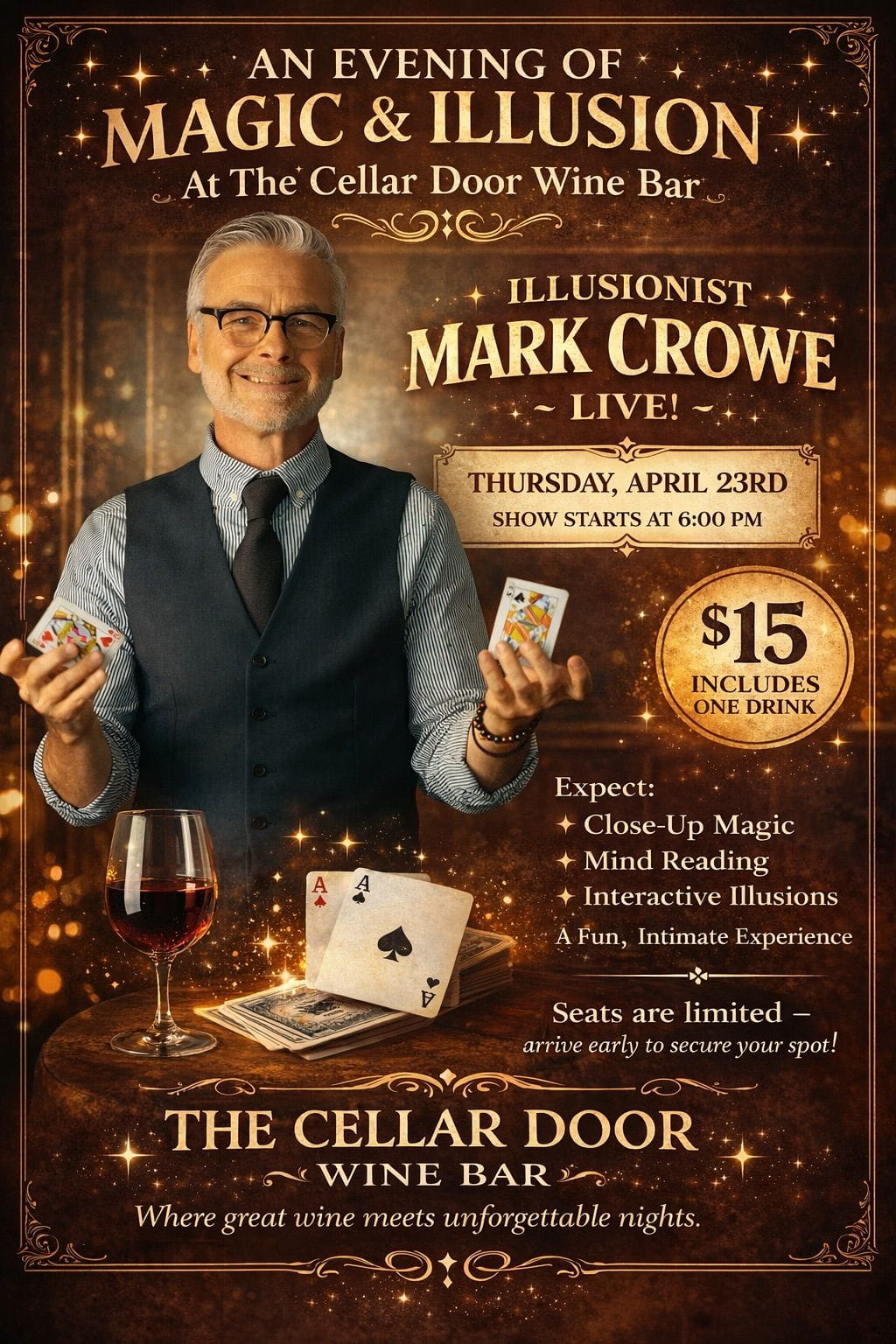 Come and be amazed by Illusionist Mark Crowe. $15 with drink included. Limited seats available.