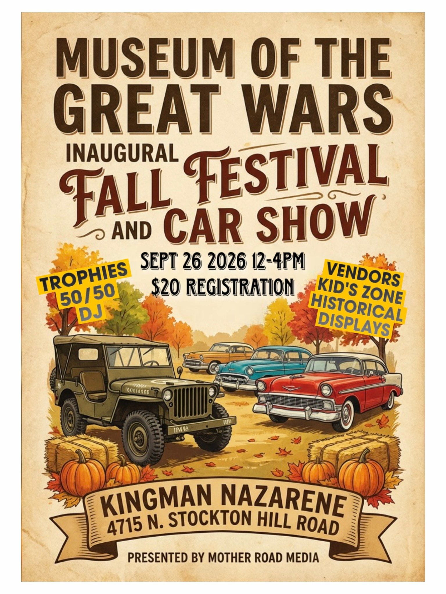 Hey folks! We are excited to present our next Mother Road Media event, in collaboration with The Museum Of The Great Wars, The Inaugural Fall Festival And Car Show! Trophies, 50/50, Vendors, a Kid’s Zone, Museum Exhibits, Military Vehicles, Music with Scott Scojo Patterson and more!