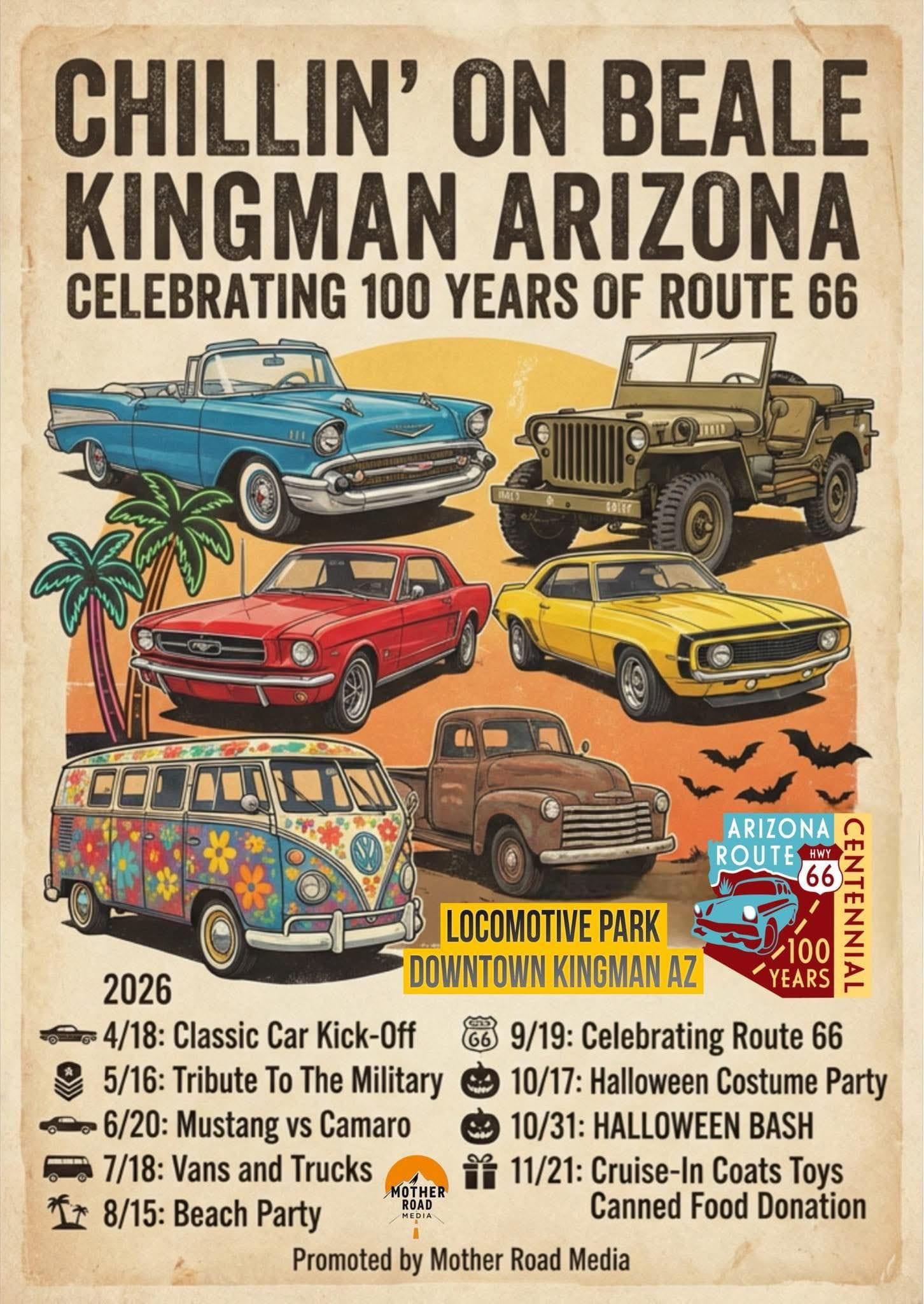 Bring your car down for a fun time. Classics, customs, creatives, motorcycles, EVs, you name it! Cruise on down to Beale Street at Locomotive Park for classic cars and down-home Kingman atmosphere! Held the 3rd Saturday monthly from April through November, each month has a different theme. Events are 3pm to 6pm each month except for July and August, which are 5pm to 8pm. Free and open to the public – vehicle spots open.