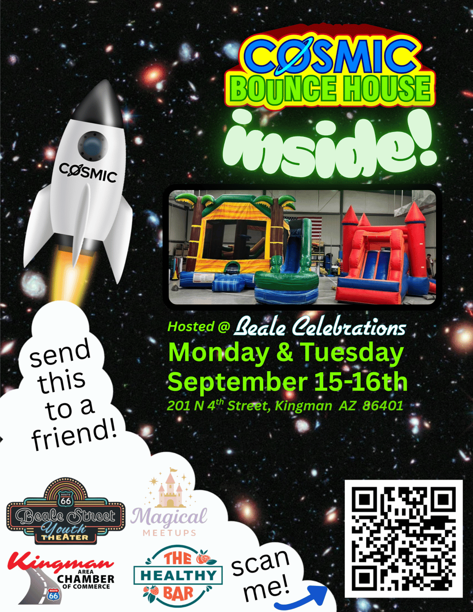 Join us for the 2nd ever “Cosmic Bounce House: Inside!”—a community‑powered indoor pop‑up to raise excitement (and funds) for a future permanent indoor play venue right here in Kingman! Why You Should Be There