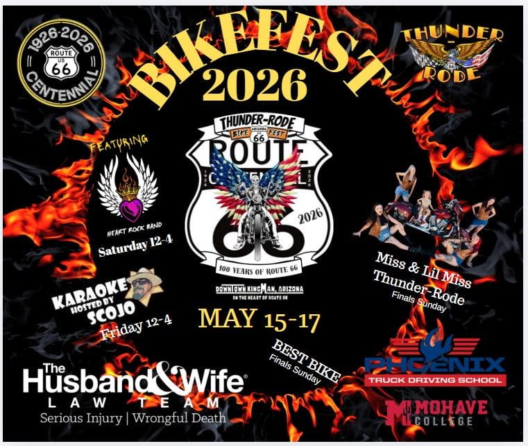 Celebrate 100 Years of Route 66 in the Heart of Route 66 3 days of BIKES, BANDS and Beauties. Family Friendly event for all. Live Music Daily, Best Bike Contest, Miss & LIL Miss Thunder-Rode Contest, Vendors, Food, Games, Raffles, Beer Garden and more.