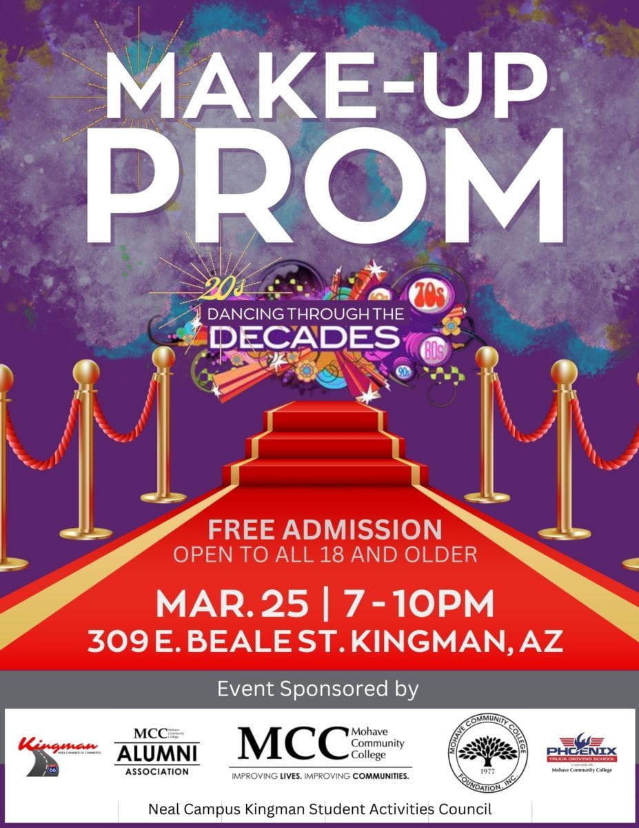 Mohave Community College is hosting a makeup prom for those who missed it due to COVID or want to relive that high school memory. The event is free and will feature music, dancing, light refreshments, and photos. Community members ages 18 and up are invited to attend the makeup prom from 7-10 PM, Saturday, March 25 at MCC’s Beale Street Center, 309 E Beale Street in Kingman. “The idea came from some of our students being disappointed that they missed their prom due to COVID,” said Erin Roper, MCC Kingman campus librarian. “This is a chance for everyone who ever missed their prom got stood up had a bad date or terrible time to have a second chance or if you loved your prom experience come down and enjoy some nostalgia.” The theme is “Decades” and attendees will have an opportunity to participate in three different prom court categories: best dressed couple, most authentic decades outfit, and most creative outfit. The event is sponsored by Student Activities Council-Kingman campus and the Mohave Community College Foundation-Kingman chapter with support from Phoenix Truck Driving Institute, Kingman Area Chamber of Commerce and Mohave Community College Alumni Association. For more information about MCC’s makeup prom, contact Erin Roper [email protected] or 928-757-0802.